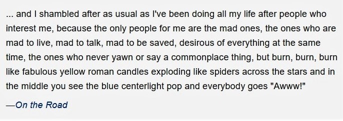His tramping way….he was a tramp, a bum, all be it a Dharma Bum. He couldn’t commit to a relationship except for the one with his mother and in many ways coopted his friends and events to his art and pursuit of fame.
