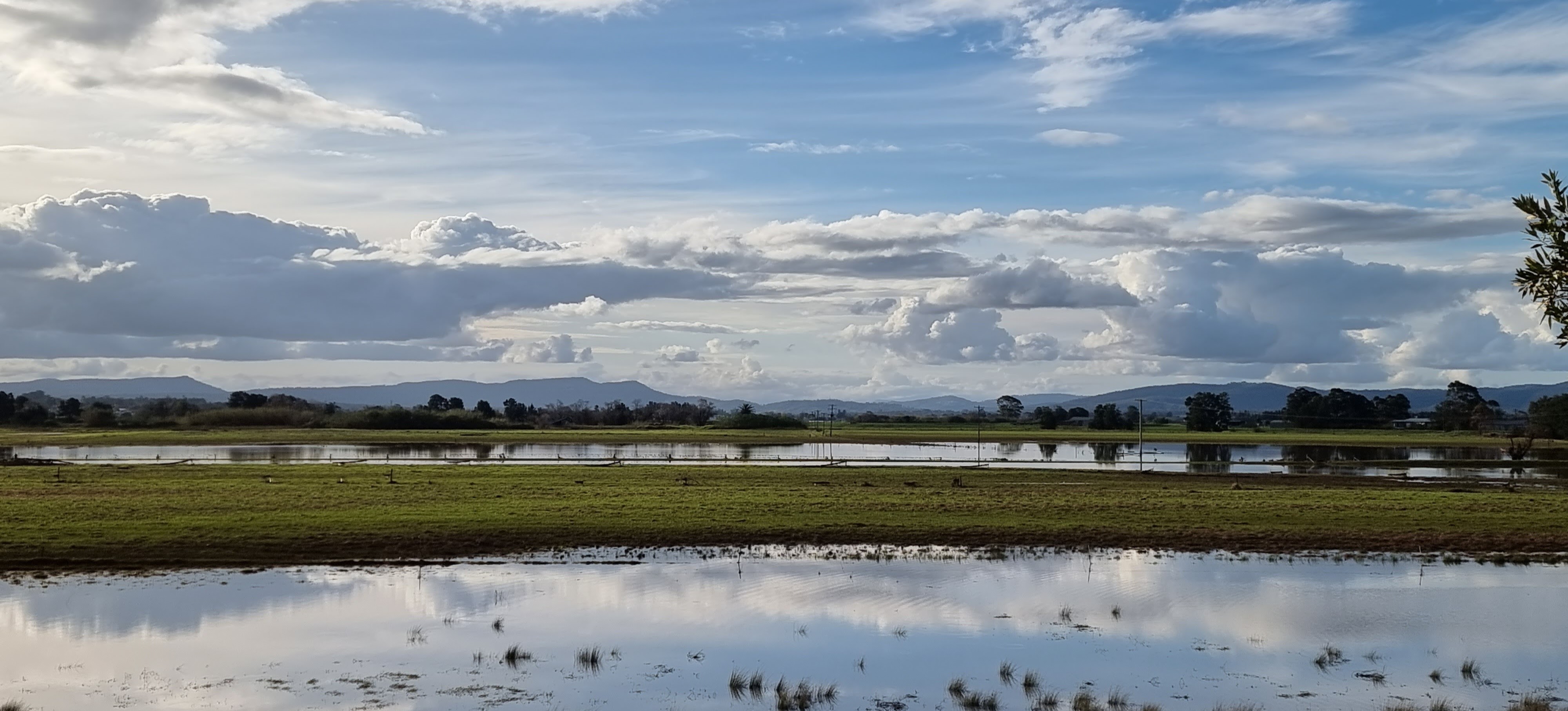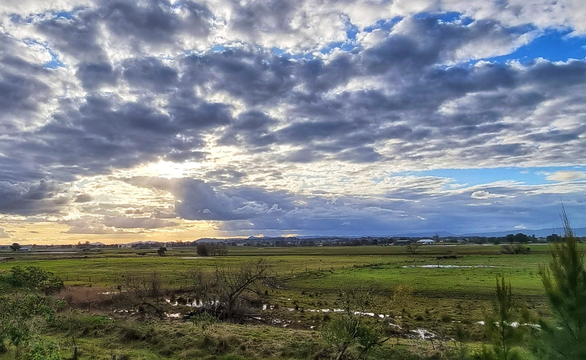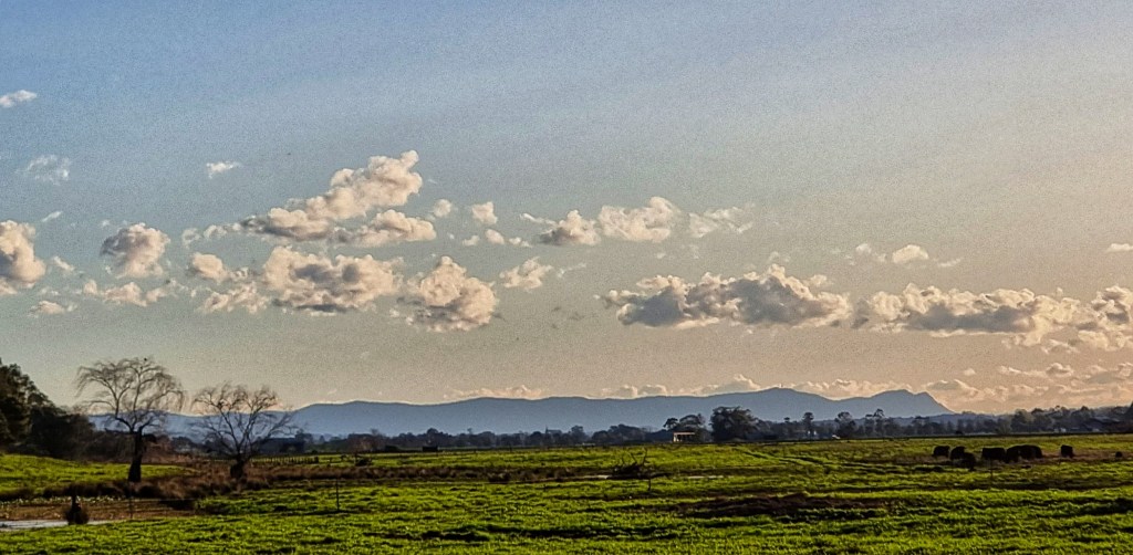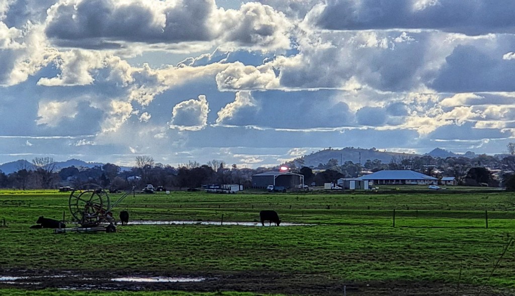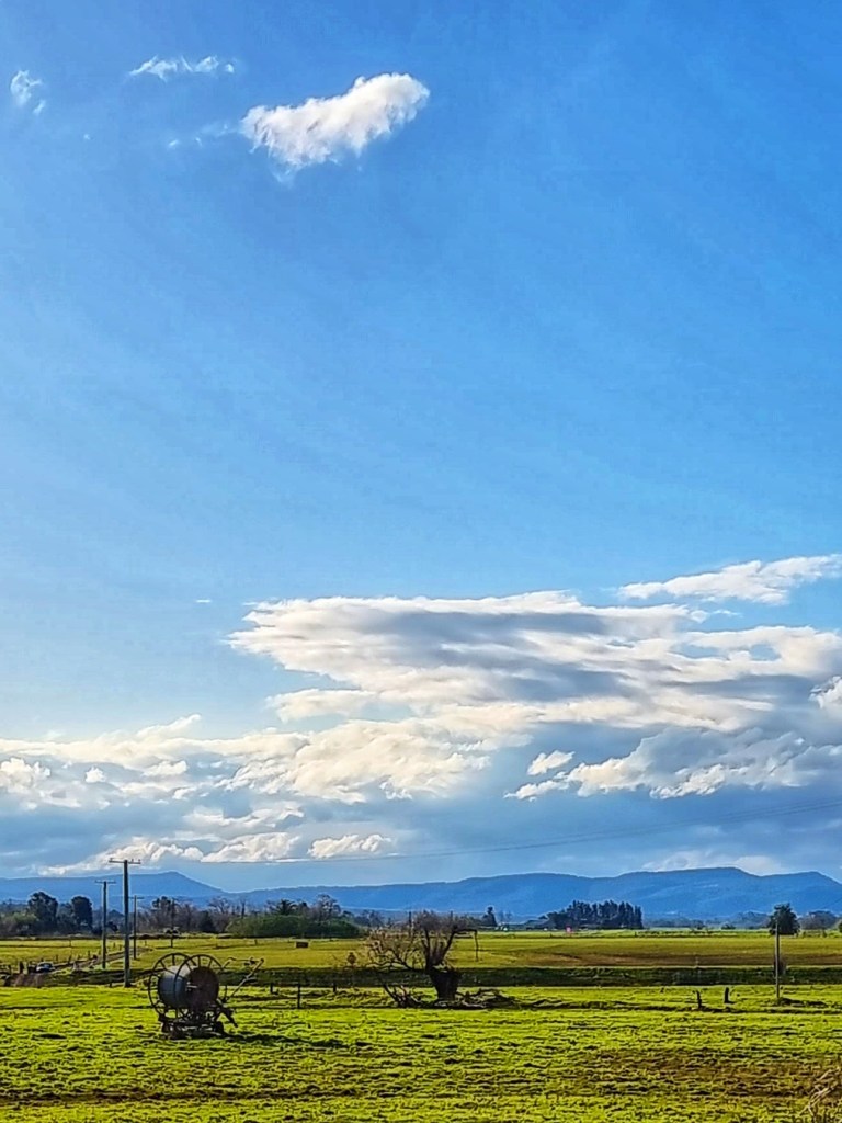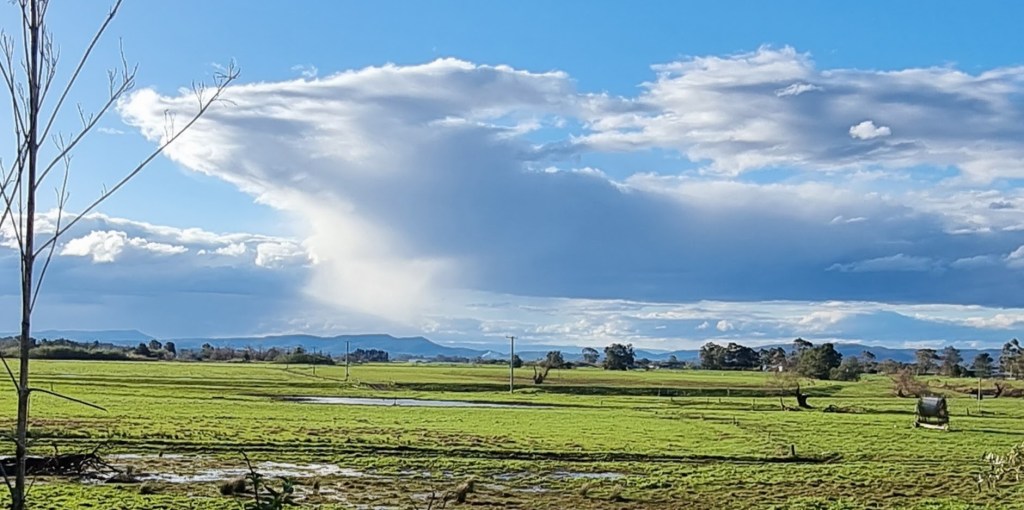 I live near a river that has a large flood plain to the north. We are very lucky because our home is on high ground so when the river floods we have “water views” but we don’t suffer the effects of a flood. The flood plain is quite large and consequently the views are expansive. This makes the sky and the clouds a prominent feature of the landscape.