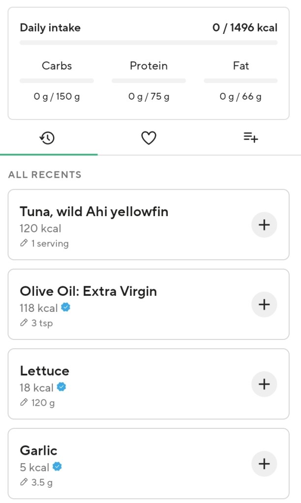Lifesum gives a variety of diets to follow and the one I use is the Mediterranean diet because it’s familiar to me. The app gives the approximate calories you need to eat each day. When you enter the foods the app calculates the numbers and during the day subtracts the calories burnt.